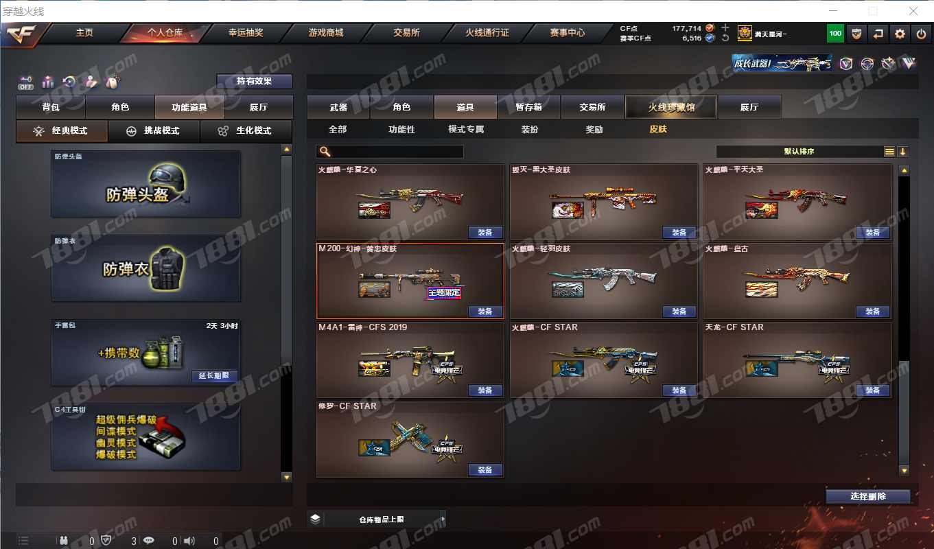 Barrett-金色蔷薇,柯尔特-冠军之特,沙鹰-天神,天神-动感闪耀,QBZ03-天罚,HK417-朱雀,M14EBR-玄武,VSK-94-金蚀,烈火-动感闪耀,盘龙-悦心,AWM-裁决,M4A1-死神,Barrett-暗月传说,AA-12-雷霆,M4A1-黑骑士,AK47-黑鲨,屠龙-动感闪耀,Barrett-极光,AK47-无影,AK47-黑武士,龙啸,M4A1-玫瑰精灵