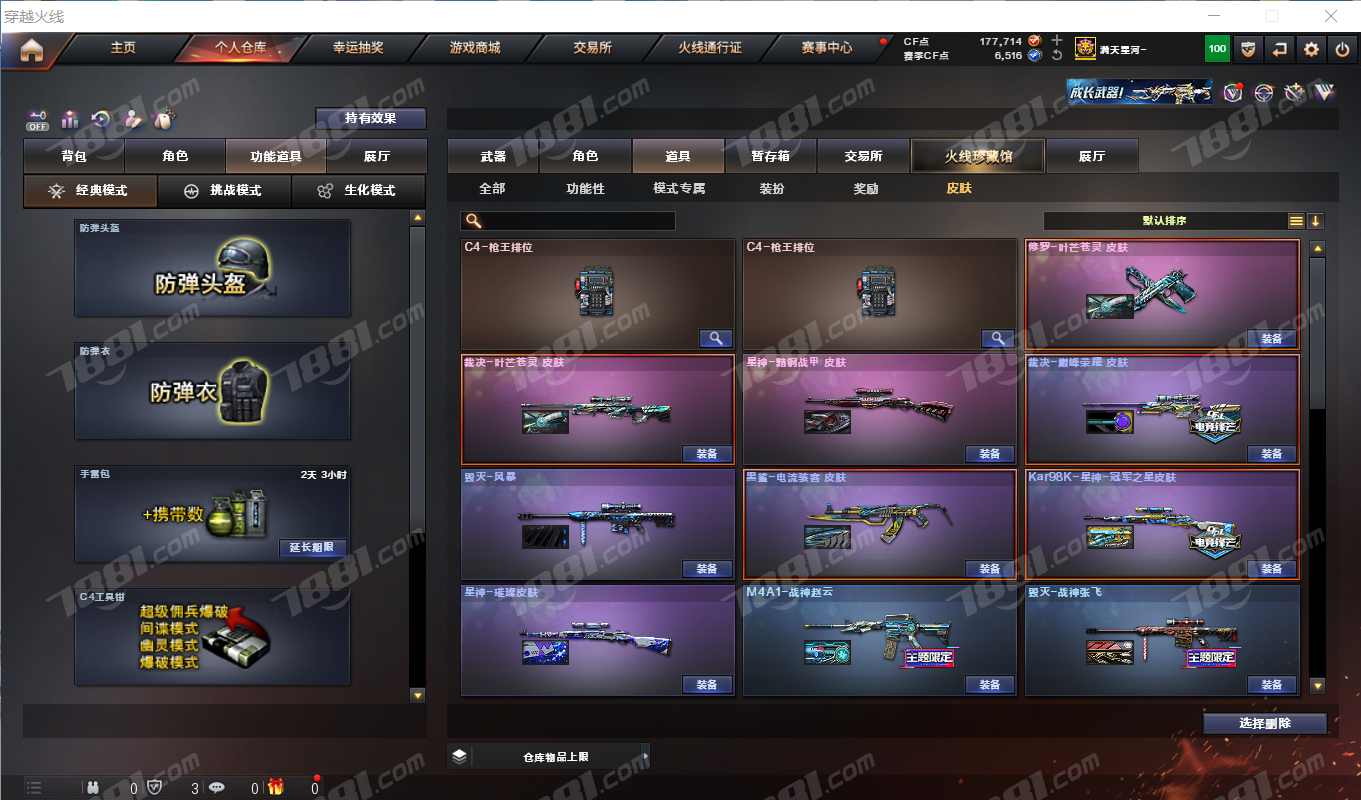 Kar98K-星神,炽芒蝶刃,AK47-黑鲨,M14EBR-玄武,异变清道夫,AK47-火麒麟,AWM-裁决,Barrett-毁灭,M200-幻神,屠龙,M4A1-死神,M4A1-玫瑰精灵,QBZ03-金色蔷薇,破空枪刃,荣耀世冠-龙啸,M4A1-黑骑士,擎天,AK47黑武士,M4A1-猎神,麒麟刺,Barrett-极光,M4A1-雷神,HK417-朱雀,QBZ03-天罚,毒蜂,汤姆逊-烈龙,AK47无影,沙鹰-天神,VSK-94-金蚀,M4A1-黑龙,M4A1-龙血,沙鹰-修罗,FAMAS G2-天绒,G36C-幻影,龙啸,USP-冥王,AA-12-雷霆,RPK-盘龙,死亡之眼
