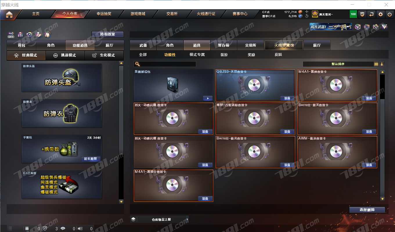 Barrett-极光音效卡,Barrett-毁灭音效卡,烈火动感闪耀音效卡,M4A1-黑骑士音效卡,M4A1-雷神音效卡,QBZ03-天罚音效卡,AWM-裁决音效卡